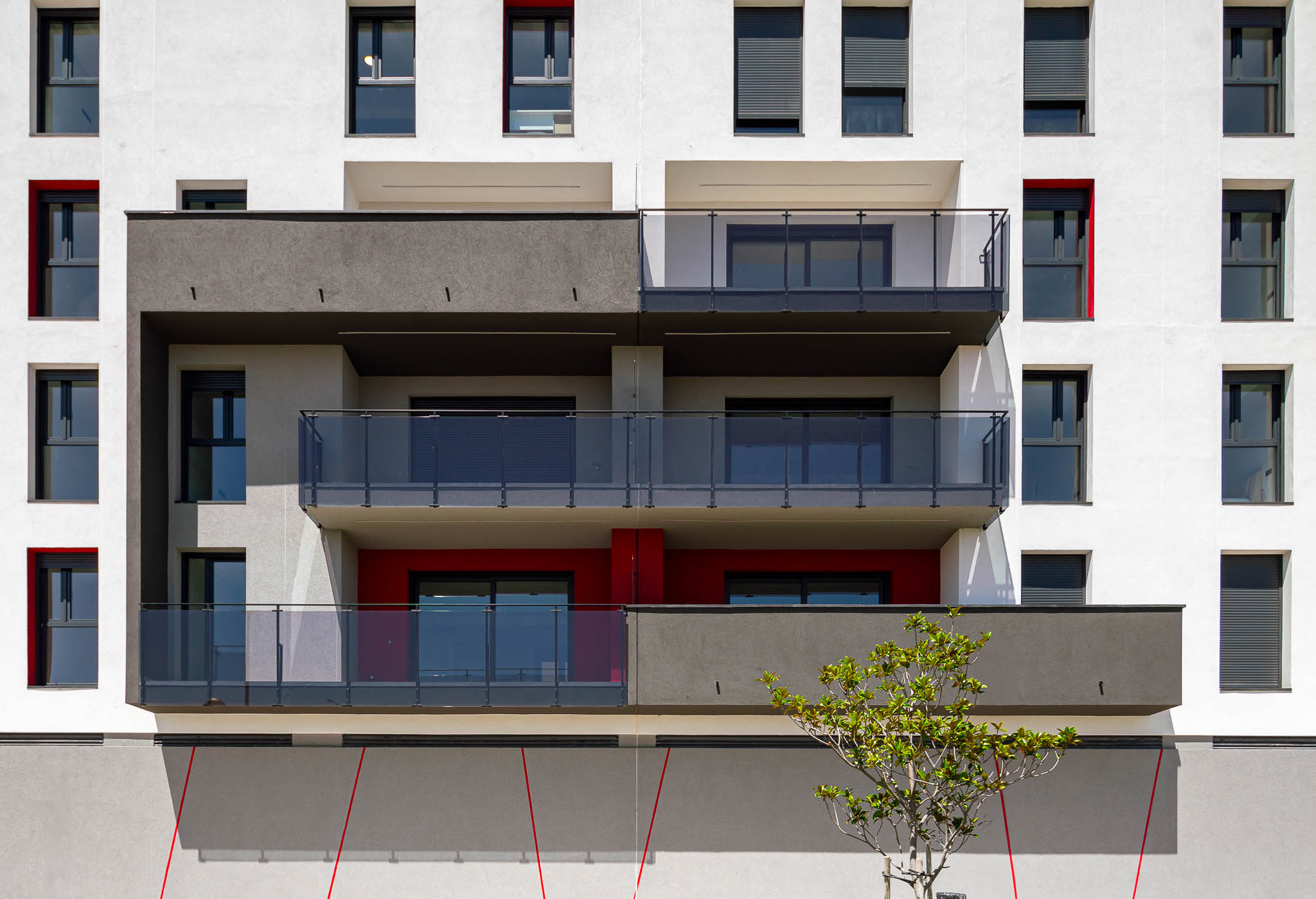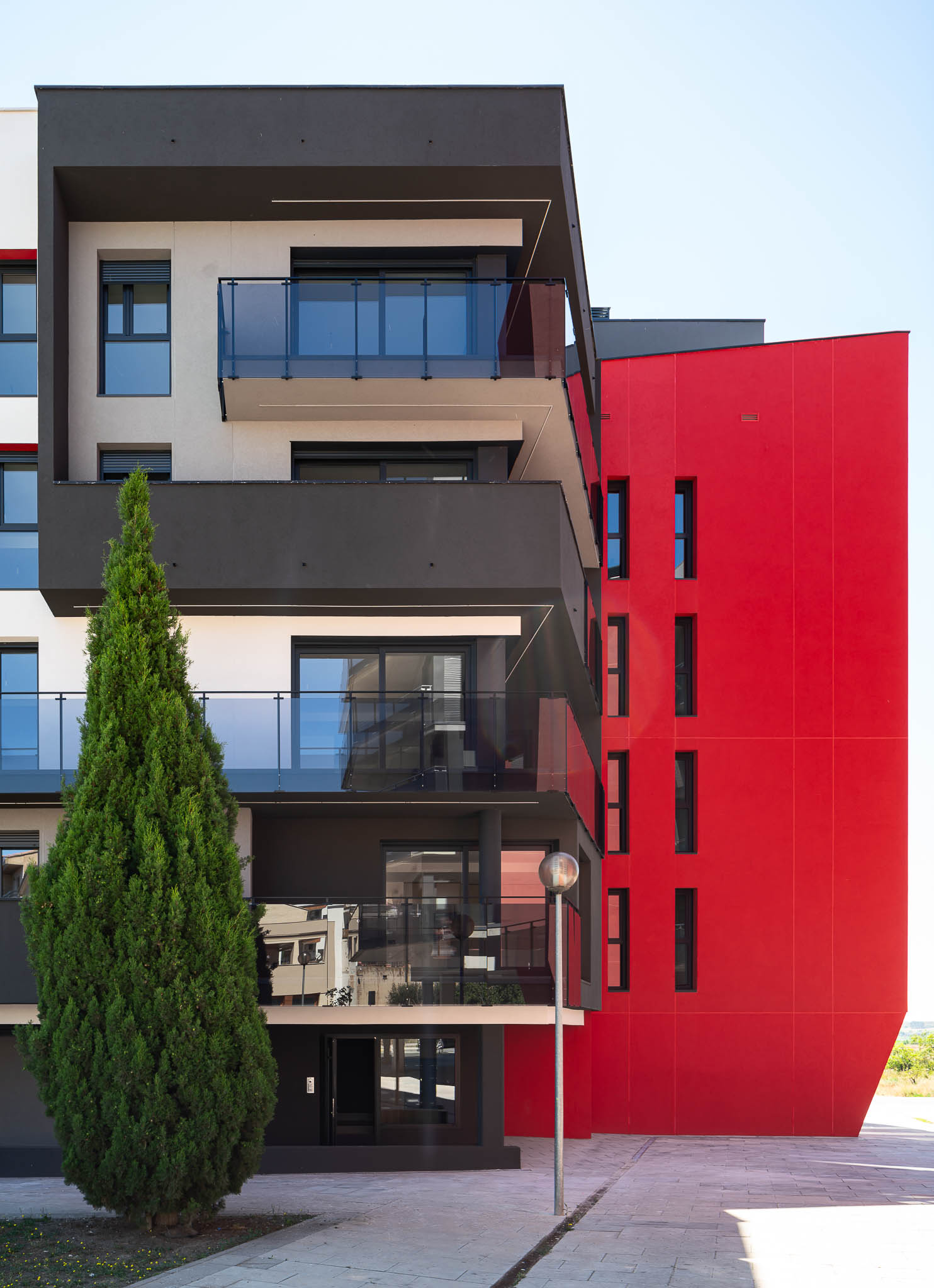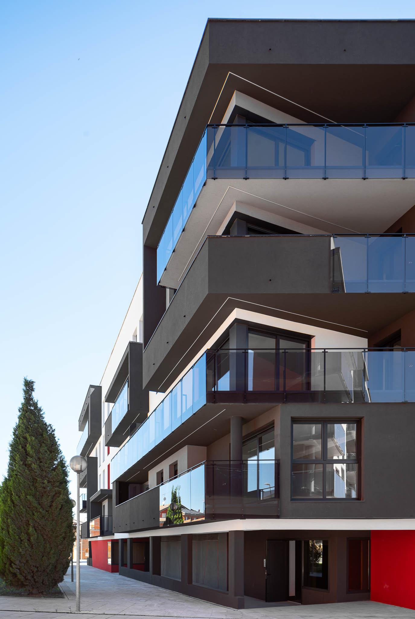 La composición volumétrica y de fachada del edificio parte de diferenciar las pastillas de viviendas generadas a Este y Oeste, marcando el volumen que contiene las zonas comunes como un elemento diferenciador mediante su geometría y color. En cuanto a las pastillas de viviendas se parte de una fachada principal de color blanco con huecos regulares, sobre la que se introduce mediante la formalización heterogénea de los cuerpos volados de terrazas el dinamismo en la fachada.