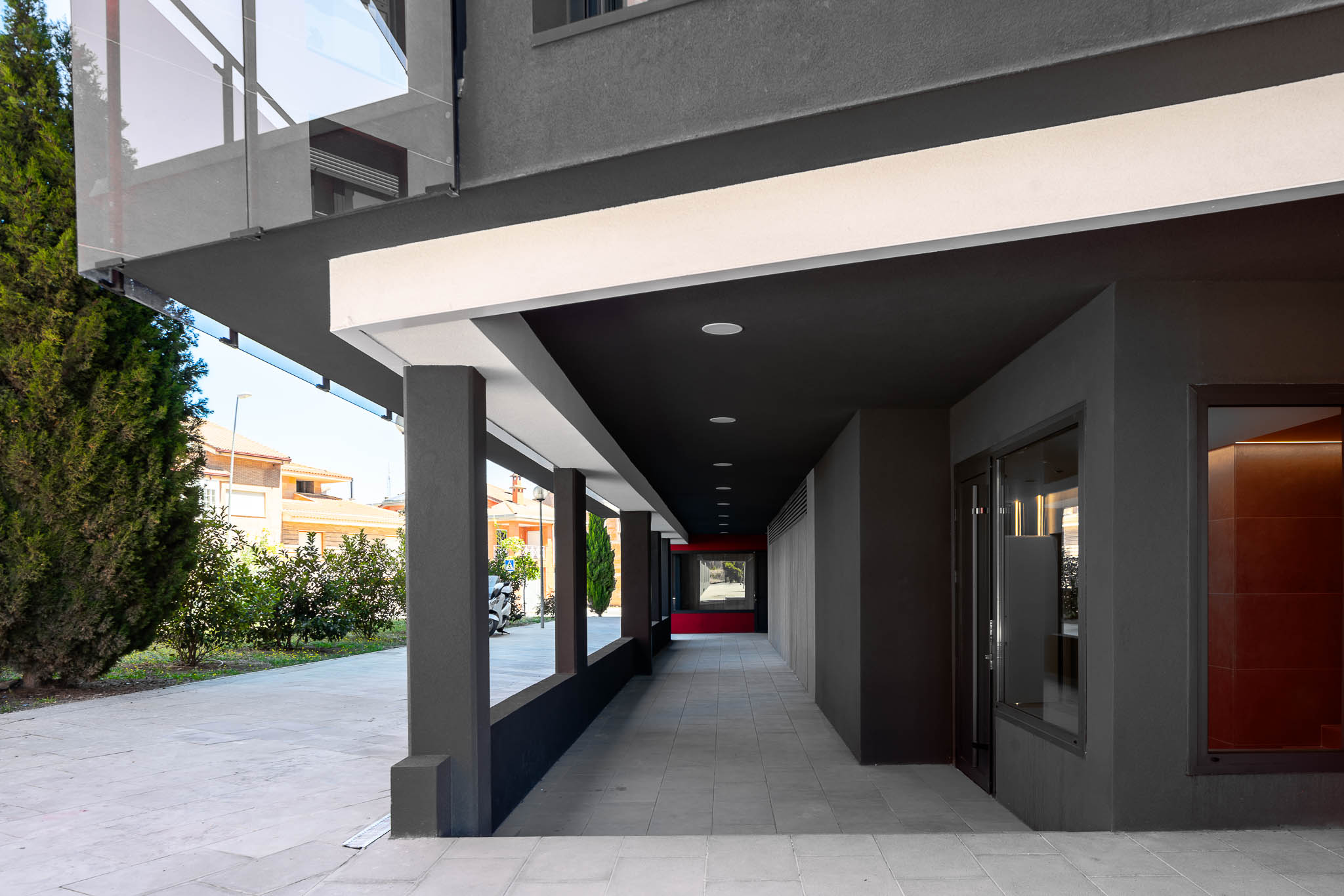 En plantas alzadas, se proyectan las unidades residenciales de viviendas, mientras que en planta baja y planta semisótano se destina su uso a aparcamiento con el fin de dar cumplimiento a las exigencias del planeamiento municipal en referencia al número de plazas. Se proyecta un porche de acceso a ambos zaguanes del edificio en la calle Benito Coll, integrando y minimizando el impacto de la planta baja de uso aparcamiento y el acceso rodado a la planta semisótano además de favorecer la continuidad con el porche creado en el edificio AFFA prexistente, construido por la misma promotora, y la relación con la urbanización existente del espacio público.
