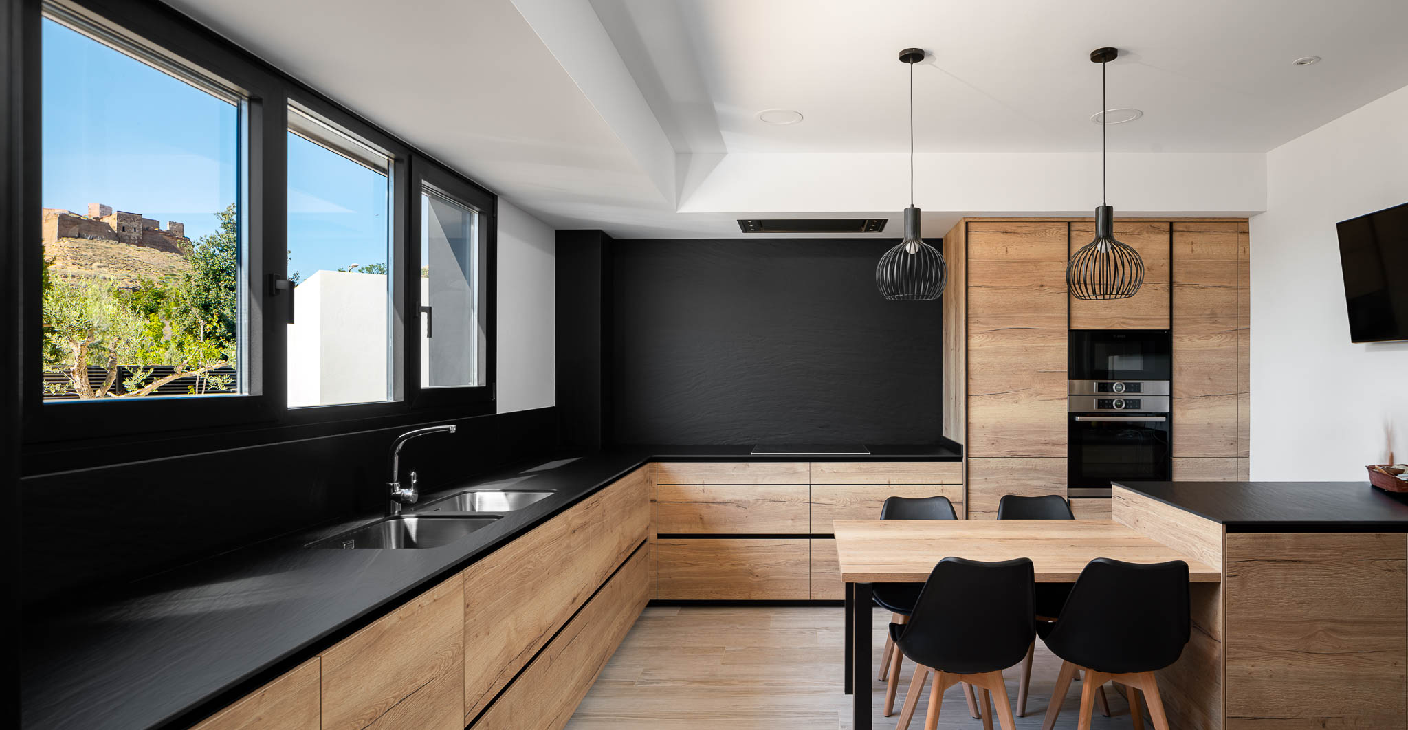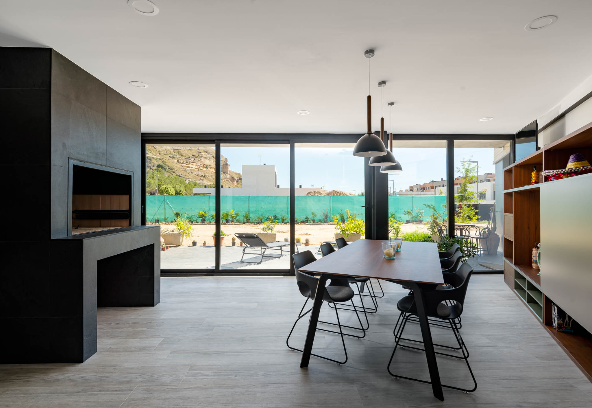Los tres volúmenes principales, con cubierta a un agua, albergan las habitaciones y baños por un lado, el garaje, cuartos de instalaciones y un estudio por otro y finalmente, la cocina y el estar-comedor.
